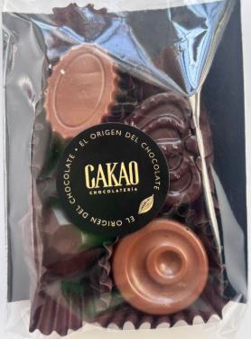 Bolsita con base incluye 4 bombones macizo en sabores de leche, semiamargo y blanco. Incluye Sticker con logo de cliente.